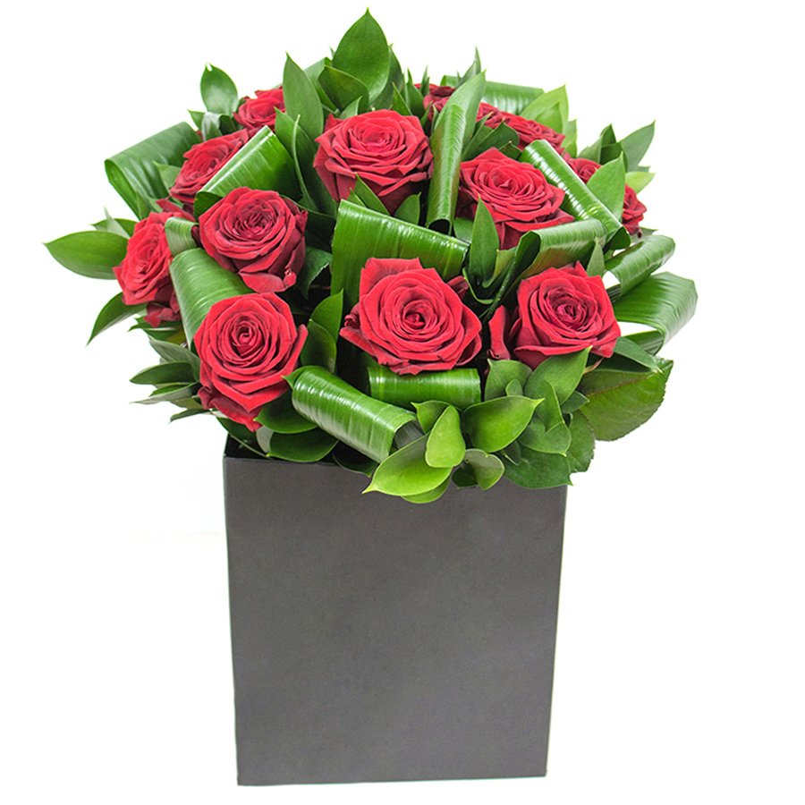 Immerse yourself in the splendor of our Luxurious Red Rose Arrangement. This exquisite bouquet combines deep red roses with the rich greenery of aspidistra and ruscus, crafting a masterpiece that exudes both charm and grace.
